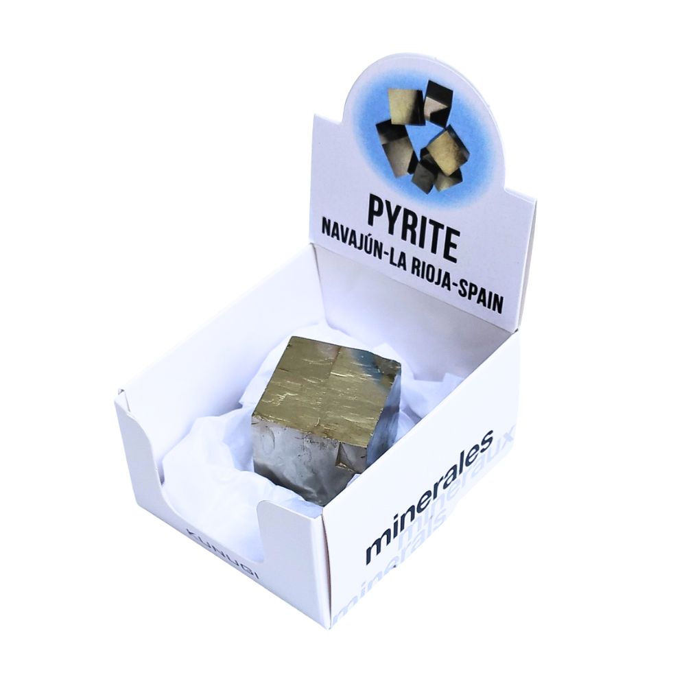 Pyrite cubes are natural crystals of astonishing geometric perfection. Their cubic shape reflects the symmetry of the crystal system they belong to (FeS₂), with flat faces, sharp edges, and exact proportions. Their metallic luster and golden color evoke gold, making these pieces true mineral jewels. Originating from deposits such as Navajún (Spain), they are highly valued by collectors and geologists. Each cube is a unique example of nature’s precision and beauty in its purest form.