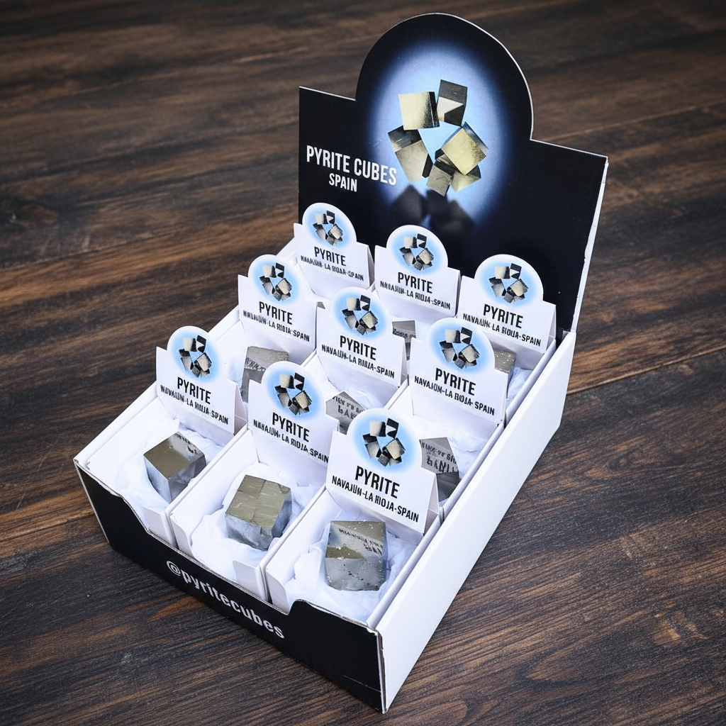 Cardboard display with 18 boxes of Cubic Pyrite.