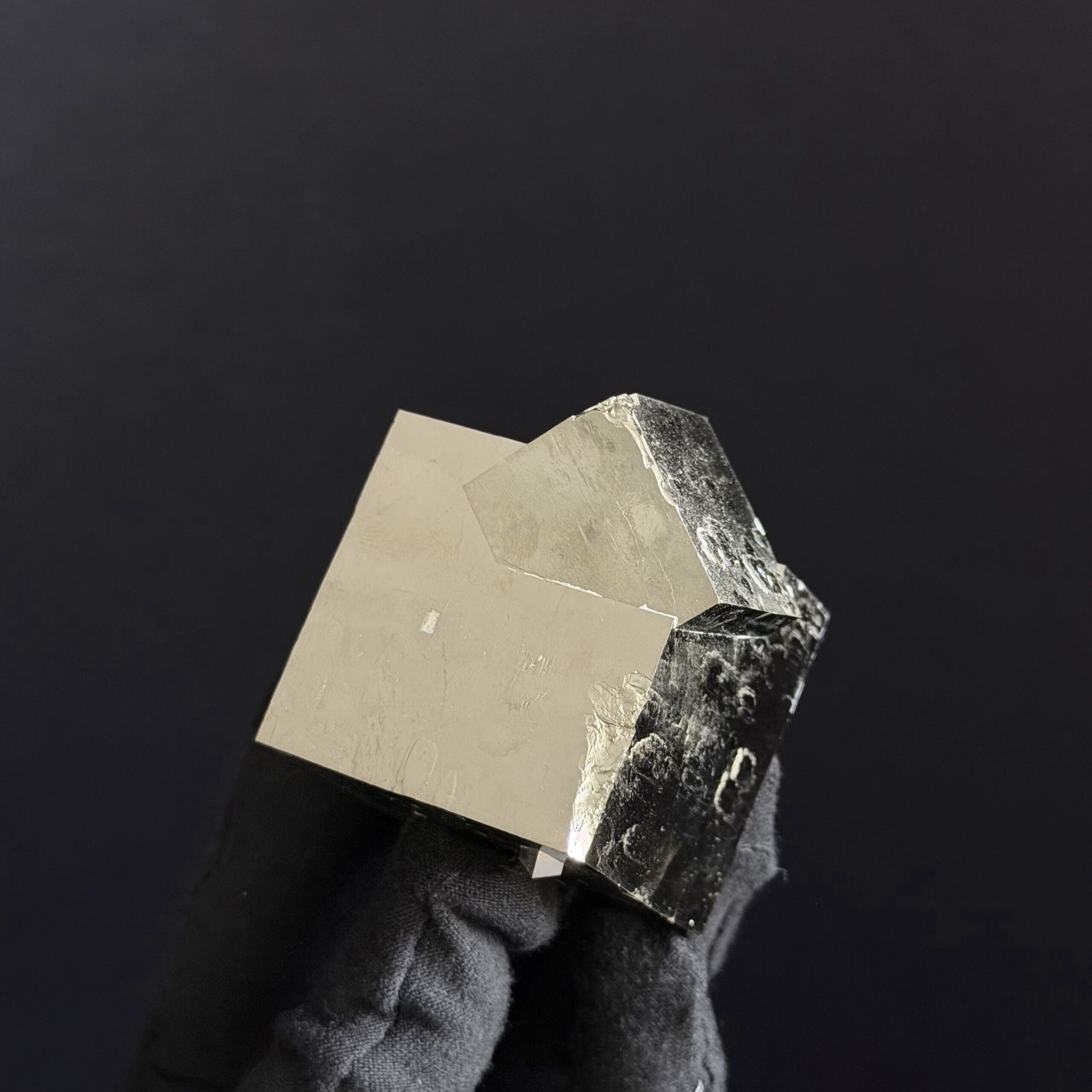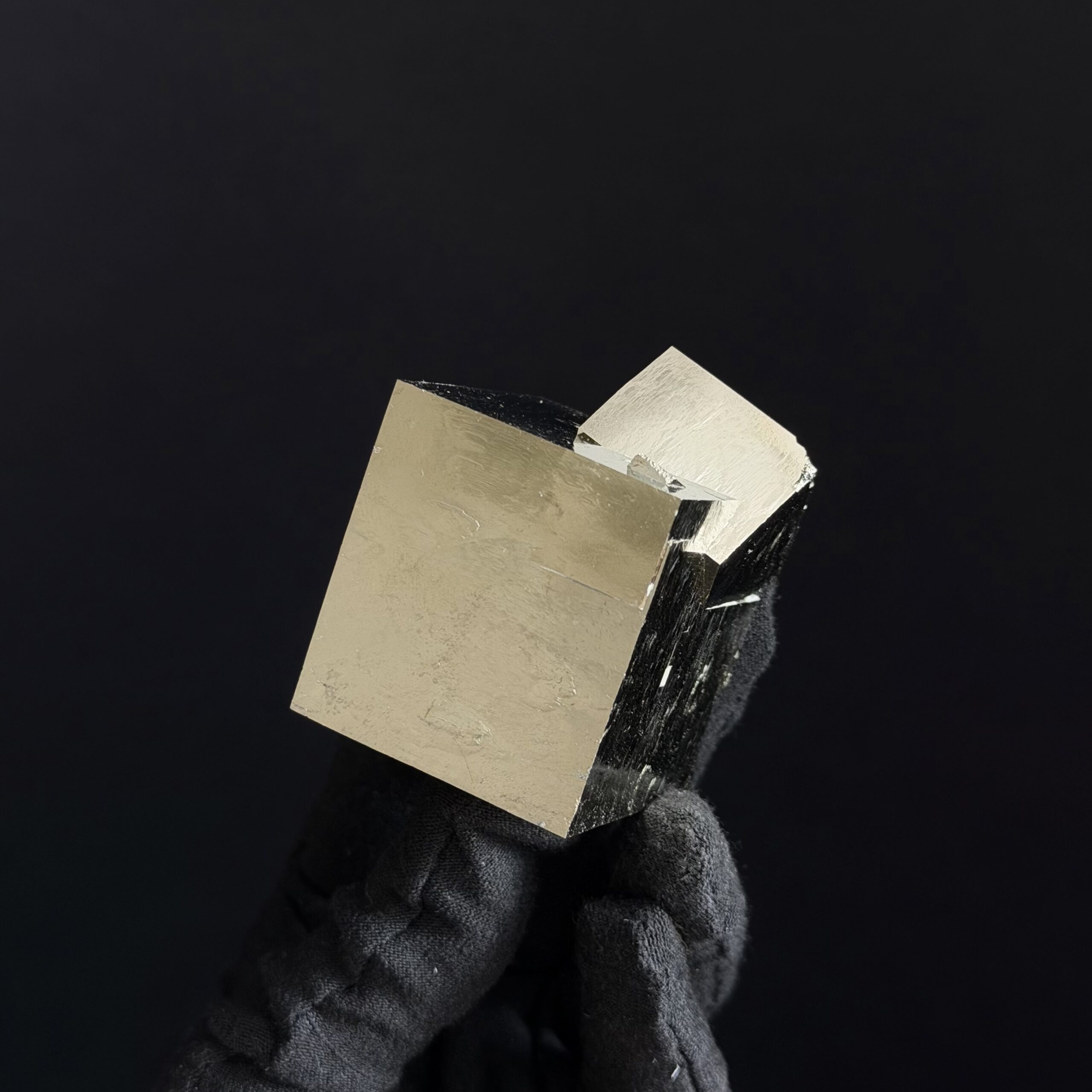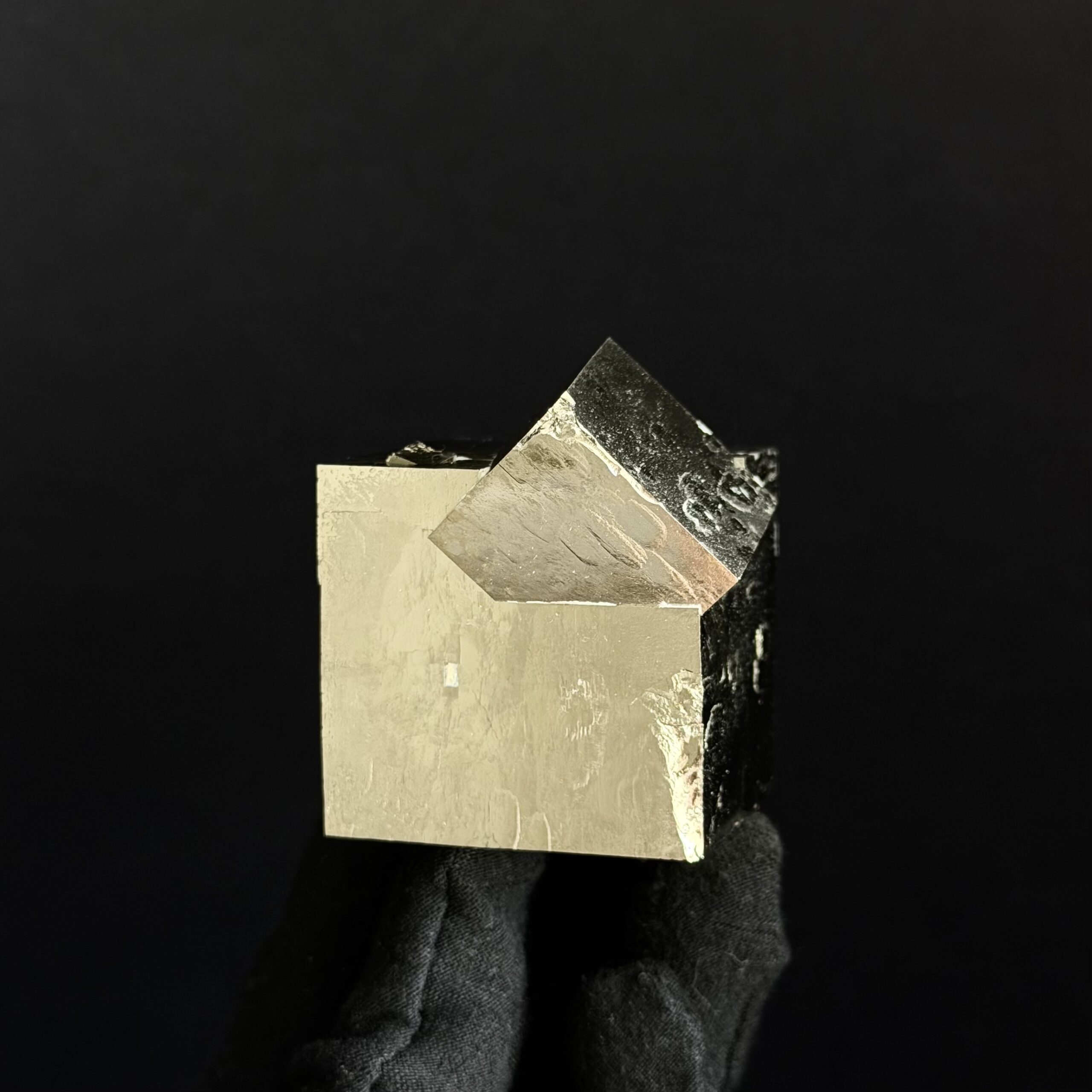 The pyrite specimen features two intergrown crystal cubes and a few small growing cubes, naturally connected in a fascinating intertwining pattern.