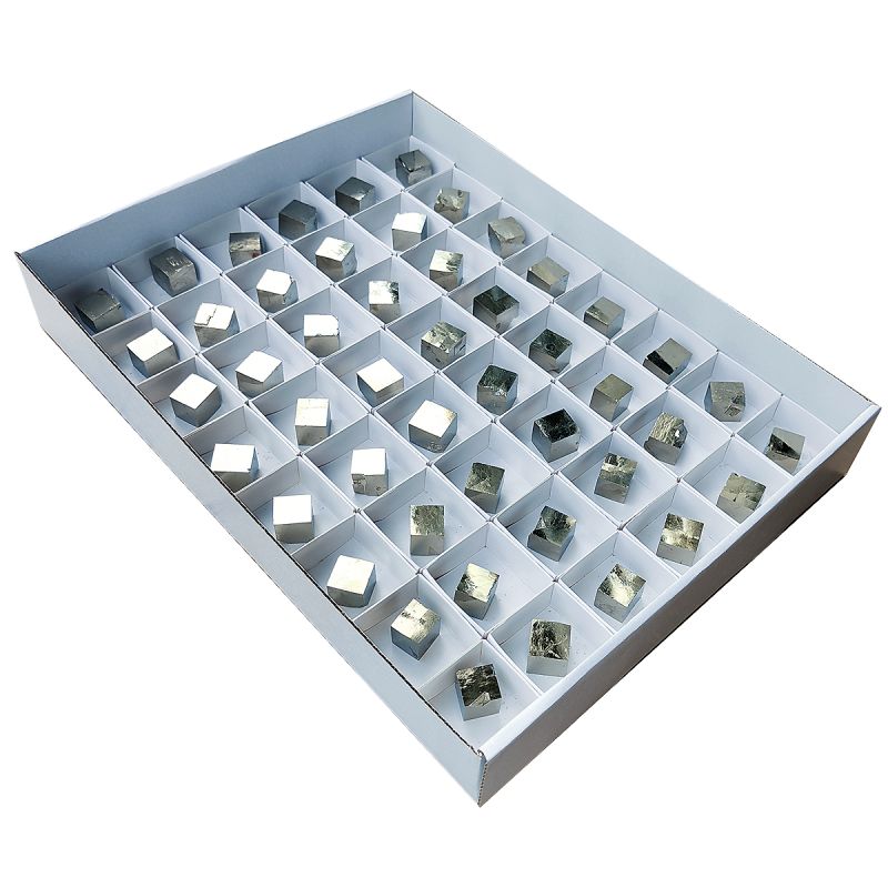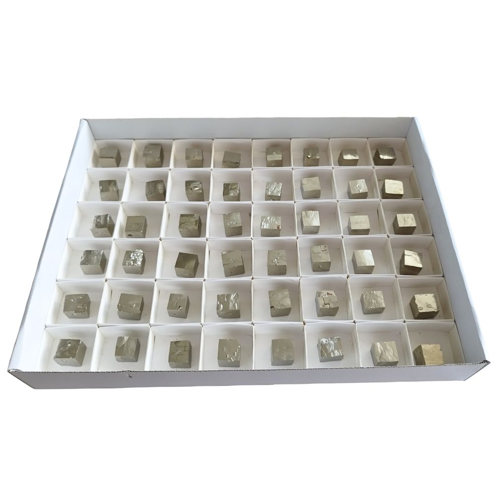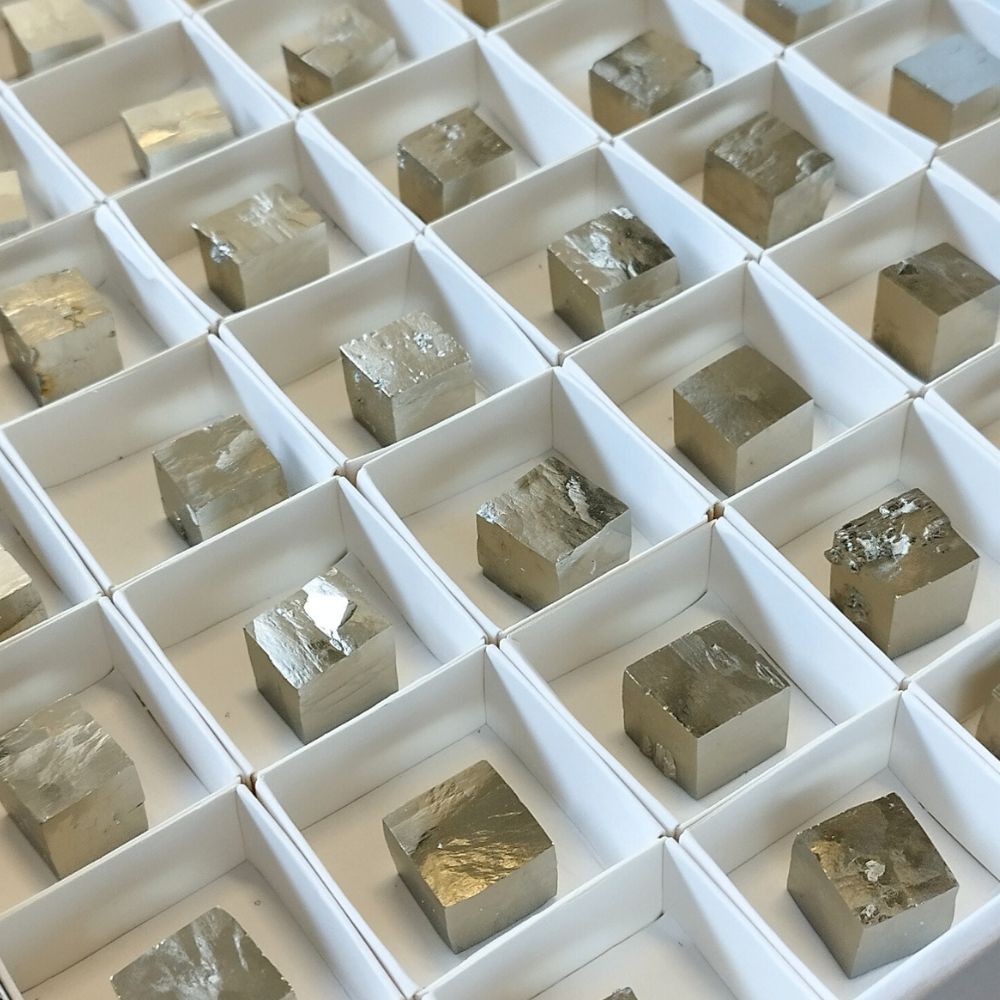 Pyrite cubes are natural crystals of astonishing geometric perfection. Their cubic shape reflects the symmetry of the crystal system they belong to (FeS₂), with flat faces, sharp edges, and exact proportions. Their metallic luster and golden color evoke gold, making these pieces true mineral jewels. Originating from deposits such as Navajún (Spain), they are highly valued by collectors and geologists. Each cube is a unique example of nature’s precision and beauty in its purest form.