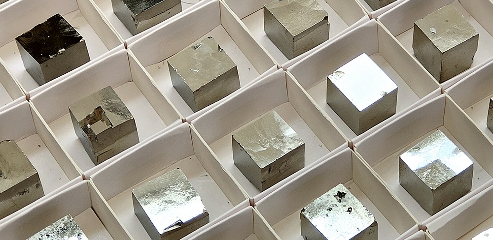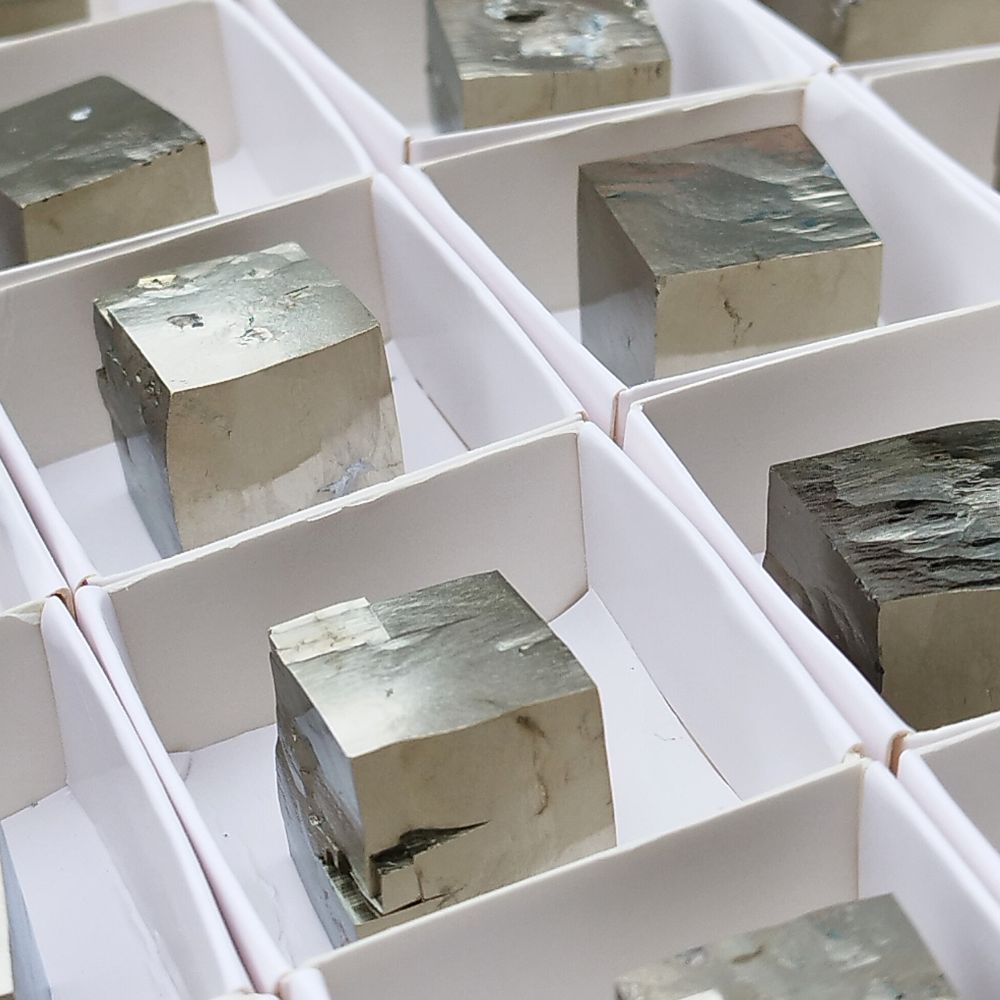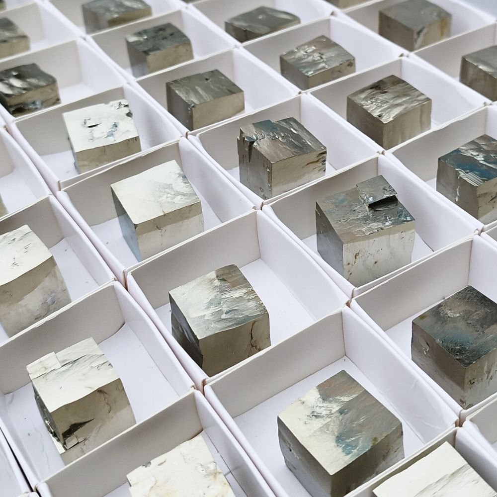 Second Quality Pyrite Cubes in 4×4 cm boxes.