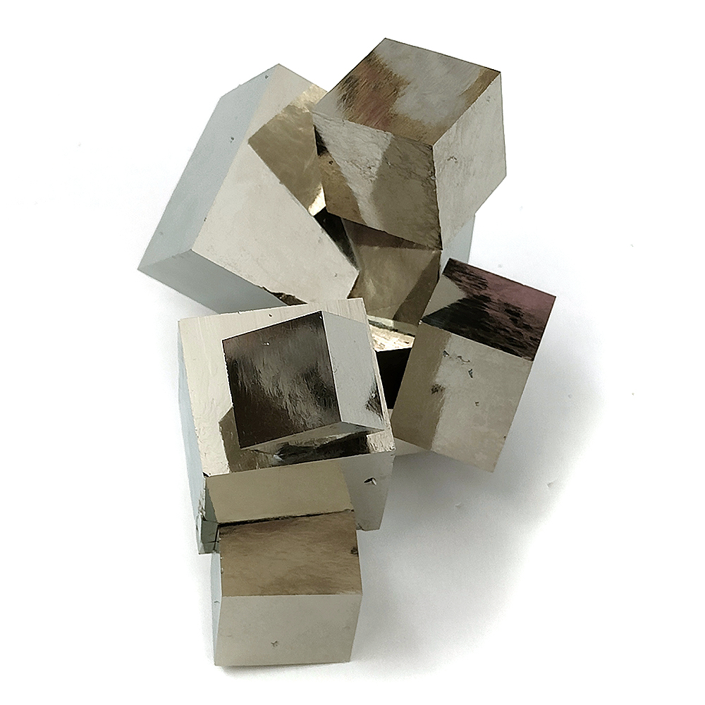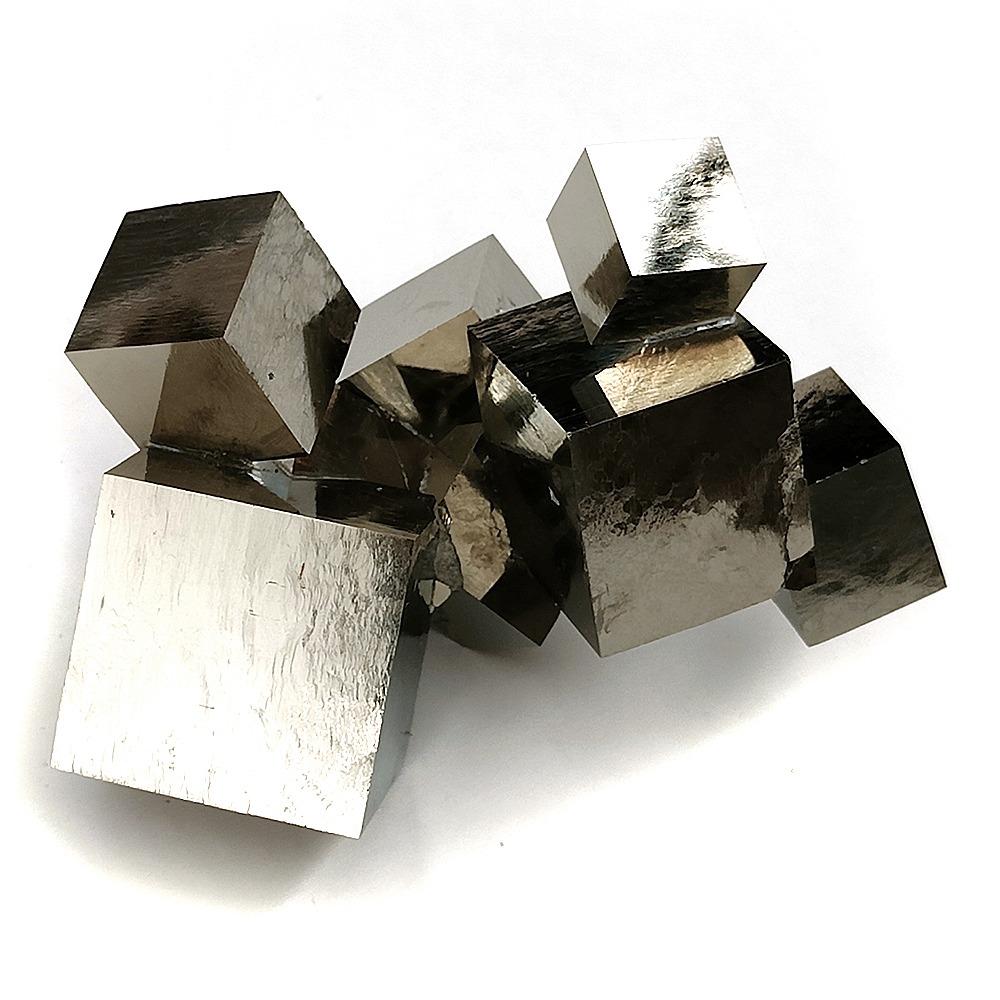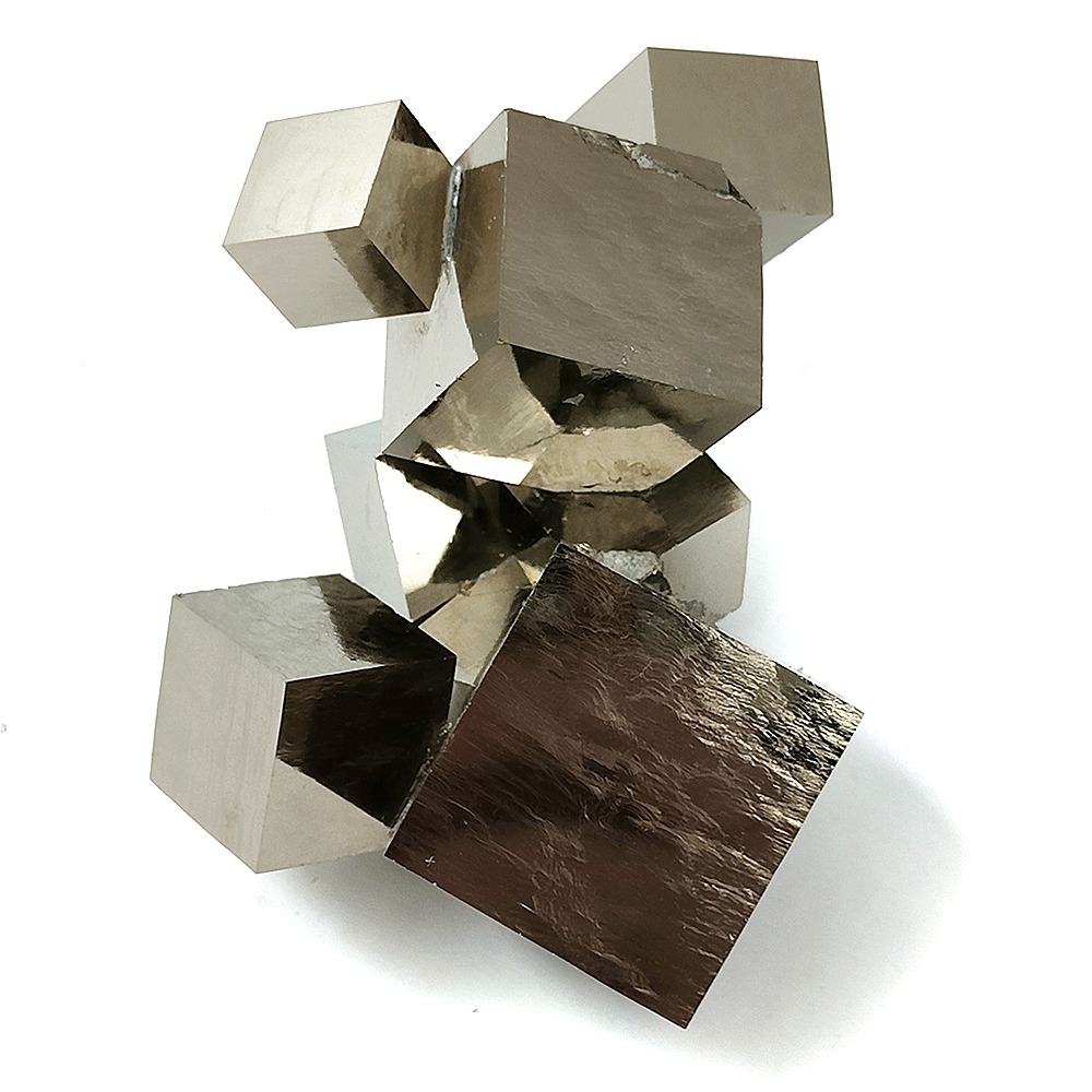 El ejemplar de Pirita presenta cubos cristalinos agrupados, conectados de forma natural en un fascinante patrón entrelazado.