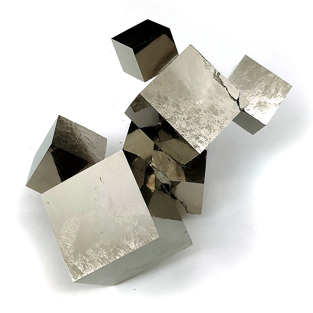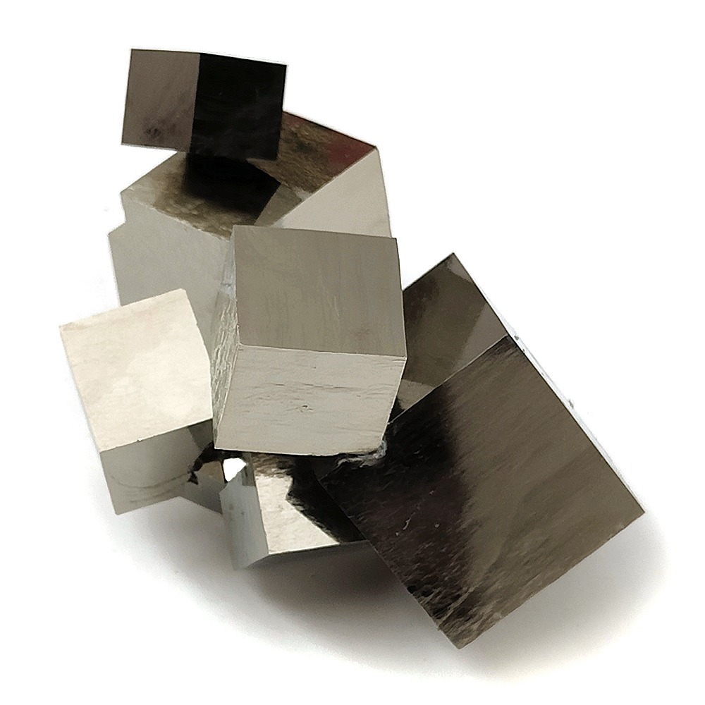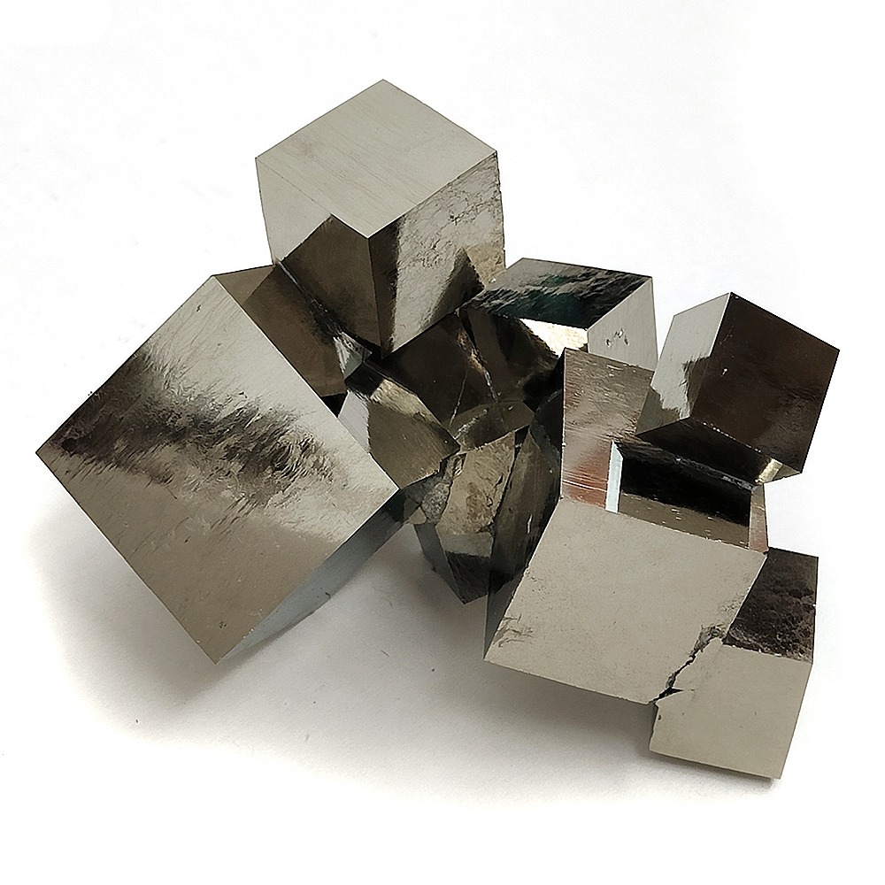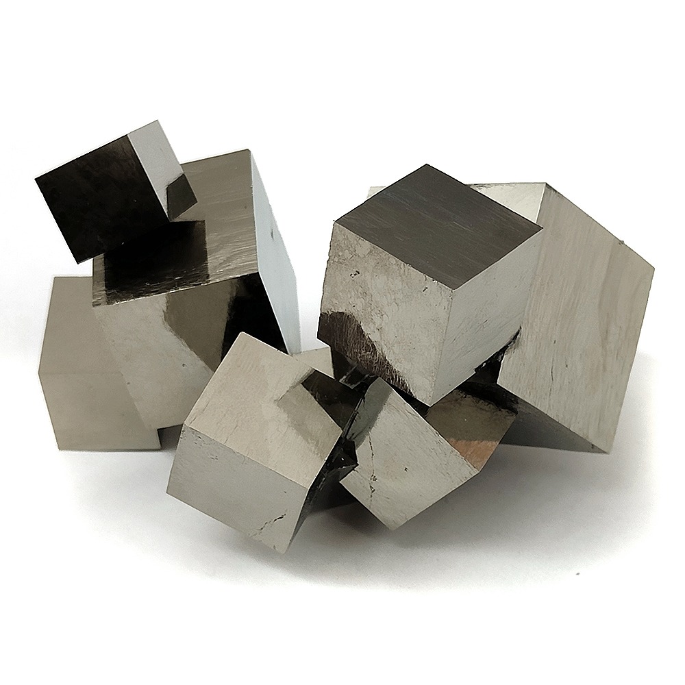 El ejemplar de Pirita presenta cubos cristalinos agrupados, conectados de forma natural en un fascinante patrón entrelazado.