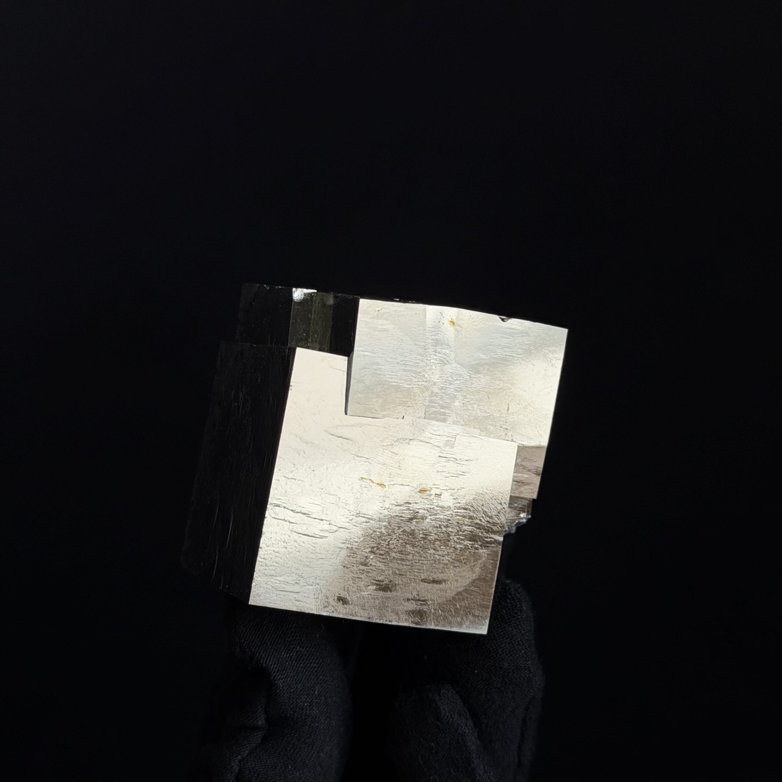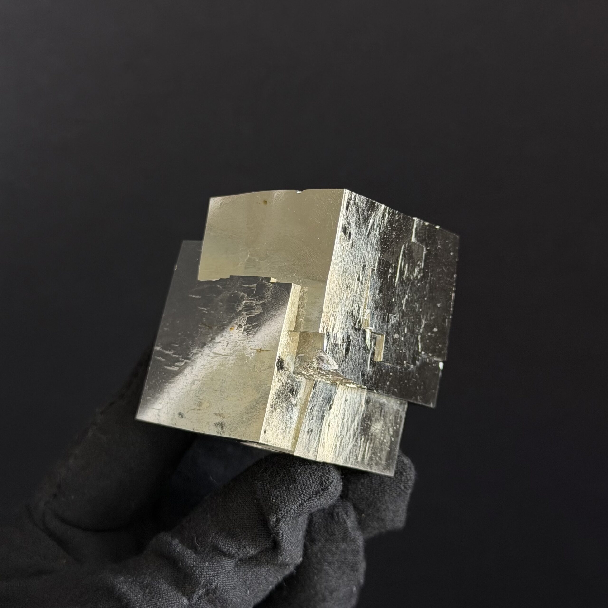 El ejemplar de Pirita presenta cubos cristalinos agrupados, conectados de forma natural en un fascinante patrón entrelazado.